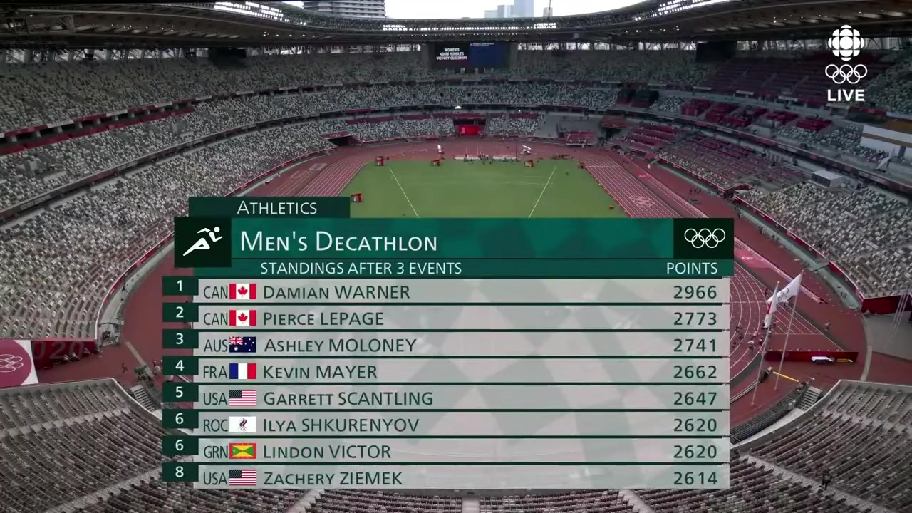 He then made the third furthest discus throw in the peloton at 48.67 meters and clocked a personal best of 4.90 meters in the pole vault to maintain his place atop the decathlon standings. Everything you need to know about the decathlon at the tokyo olympics as australians ashley moloney and cedric dubler take on the world. Canada's damian warner is two events away from an olympic gold medal in decathlon. One of the many events that have taken place so far at the u.s. The 2016 olympic bronze medalist is 223 points clear of fellow canadian pierce lepage and.
